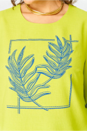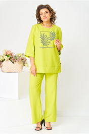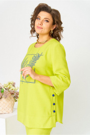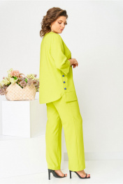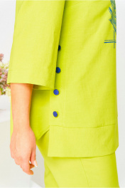 Костюм женский свободного силуэта, состоит из блузки и брюк. Костюм выполнен из стрейчевой костюмной ткани. Блузка с рукавом 3/4, горловина округлая. Перед с нагрудными вытачками, спинка с кокеткой и складкой из под нее. Низ блузки фигурный, по переду манжет. В боковых швах шлицы с пуговицами. В области груди печать. Брюки расширенные, с карманами, на поясе с резинкой. Длина изделия блузка: размеры 50-54 - 78 (±1) см.; брюки: 98 (±2) см. Длина рукава 45 (±1) см. Объём груди размер 50 – 115 (±2) см. размер 52 – 119 (±2) см. размер 54 – 123 (±2) см. Объём талии блузка: размер 50 – 112 (±2) см. размер 52 – 116 (±2) см. размер 54 – 120 (±2) см. брюки: размер 50 – 78 (±2) см. размер 52 – 82 (±2) см. размер 54 – 86 (±2) см. Объём бёдер брюки: размер 50 – 116 (±2) см. размер 52 – 120 (±2) см. размер 54 – 124 (±2) см. Ширина рукава под проймой размер 50 – 18 (±1) см. размер 52 – 19 (±1) см. размер 54 – 20 (±1) см. Ширина спинки размеры 50-54 - 42 (±0,5) см.;