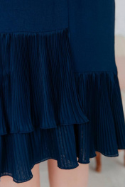Длина изделия по спинке: 105 см Платье комбинированное (текстиль и плиссированный шифон), силуэта трапеция с коротким рукавом. Горловина округлая. Застежка на тесьму молнию по среднему шву спинки. Перед с вертикальным релье-фом и щелью