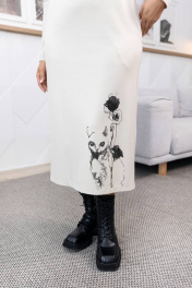 Длина изделия по спинке: 124 см Платье прямого силуэта с длинным рукавом с округлым вырезом горловины с воротником стойкой. По переду и спинке отрезной лиф, на нижней части переда декоративная печать. Карманы в боковых швах, по среднему шву спинки шлица