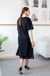 Длина изделия по спинке: Туника - 112 см Платье – 112 см Комплект женский комбинированный. Туника прямого силуэта с коротким рукавом. Горловина V-образной ассиметричной формы. По низу декоративные люверсы. Нижнее платье прямого силуэты с длинным рукавом и округлой горловиной с воротником стойкой.