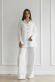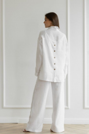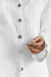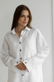 Рубашка выполнена из 100% умягченного льна, который прошел специальную энзимную обработку, поэтому изделие не колется и не дает усадки. Рубашка свободная, прямая, со спущенным плечом и длинным рукавом с манжетой. Застежка центральная на петли и пуговицы. Воротник рубашечный, по переду карманы. По спинке сделана глубокая шлица на пуговицах.