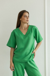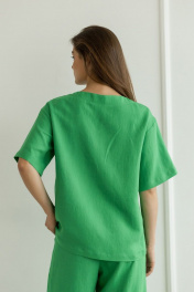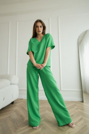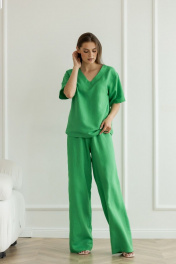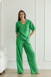 Летний леновый костюм брюки палаццо и блуза с вырезом Atelero 1072 зеленый