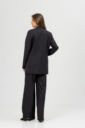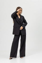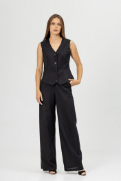 Костюм классический на подкладке,состоит из жакета ,брюк и жилета.Жакет прямого силуэта с воротником пиджачного типа, с застежкой на одну пуговицу.Рукав втачной,карманы с клапанами и немного расширена ширина плеча.Брюки палаццо, высокой посадки. Пояс частично на резинке.Застежка на молнию и петлю с пуговицей.В боковых швах карманы.Жилет полуприлегающего силуэта на подкладке,по переду и спинке рельефы,горловина с глубоким вырезом.Застежка на петли и пуговицы.