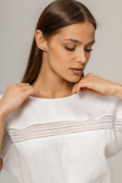 Платье выполнено из умягченного льна,который прошел специальную энзимную обработку,поэтому изделие не колется и не дает усадки.Платье по талии отрезное,на кулиске.Юбка длинная с отделочной тесьмой.Рукав спущенный ,по переду отделка тесьмой.