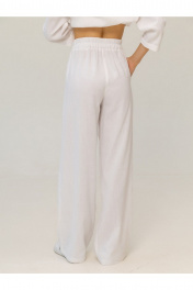 Брюки выполнены из умягченного льна,который прошел энзимную обработку,поэтому изделие не дает усадку после стирки, не колется и не создает неприятных ощущений в носке . Брюки палаццо,немного расширены к низу,с высокой посадкой. По талии на резинке,в боковых швах карманы.