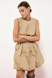Платье-баллон из хлопковой ткани в длине мини. Платье приталенное по талии по линии талии пояс из основной ткани изделия. По бокам юбки накладные клапаны. Платье на подкладке. По спинке застежка на потайную молнию. Длина платья по спинке 86 см