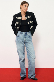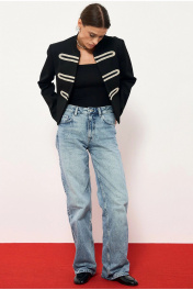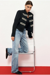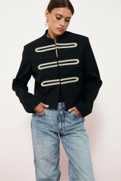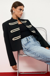 Жакет прямого кроя из костюмной ткани. По переду потайная застежка на петли. Горловина-стойка. Рукав втачной, есть подплечники. Жакет на подкладке. По переду жакета оттелка из декоративной тесьмы. Длина жакета 50 см.