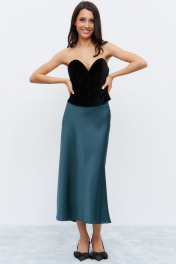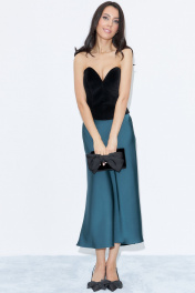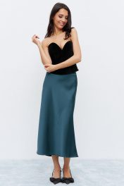 Юбка А-образного силуэта, свободная к низу изделия, выполнена из струящегося полотна глубокого изумрудного цвета. Юбка на обтачке, застежка потайная молния сбоку изделия. Юбка в длине миди