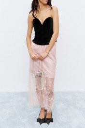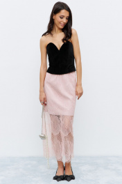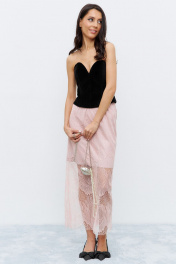 Юбка в длине миди, на резинке, декорирована кружевом. Основная ткань - костюмная, в розовом цвете.