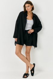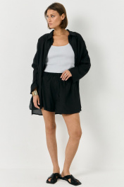 Комплект двойка в черном цвете из ткани - вуаль. Комплект состоит из рубашки и шорт. Рубашка прямого свободного кроя. Линия плеча спущена, по переду застежка на пуговицы в цвет всего изделия. По бокам рубашки разрезы. Шорты на резинке, свободного кроя, А-силуэт, по бокам карманы.