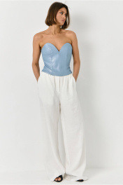 Топ, выполнен в корсетном стиле из джинсовой хлопковой ткани с перламутровым напылением. По спинке застежка на разъемную металлическую молнию.
