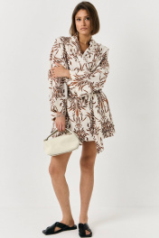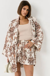 Комплект двойка из вискозы. Комплект состоит из рубашки в стиле кимоно и шорт. Рубашка прямого свободного кроя. Рукав на манжете. Рубашка со съемным поясом из основной ткани изделия. Шорты на резинке, свободного кроя, A-силуэта. По бокам функциональные карманы.