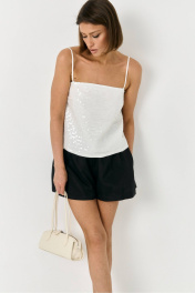 Топ на брителях, прямого свободного кроя, выполнен из ткани с добавлением пайеток. Топ полностью на хлопоковой подкладке, для вашего комфортного лета.