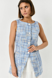 Жилет полуприлегающего силуэта, из легкой твидовой ткани в нежном голубом цвете, на подкладке. По переду застежка на пуговицы. По бокам прорезные нефункциональные карманы.
