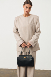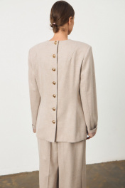 Жакет прямого свободного кроя. По переду бокавые клапаны. По спинке функциональная застежка на декоративные пуговицы. Рукав втачной, линия плеча слегка увеличена, есть подплечники. По низу рукава белая подкладка, которую можно использовать, как манжет. Жакет на подкладке. Длина жакета по спинке: 68 см Брюки прямого свободного кроя. Пояс стабильный. Брюки приталенные, расширенные к низу. По передней части прошитые швы.