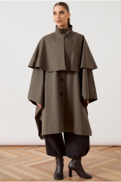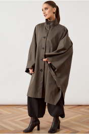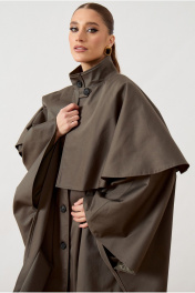 Тренч женский, свободного силуэта, из костюмно-плащевой ткани. Модель с воротником-стойкой и застежкой на петли и пуговицы. Изделие дополнено объемной отлетной кокеткой по переду и спинке, имитирующей кейп. Рукав цельнокроеный, переходящий в широкую форму, с разрезами в нижней части для свободы движения. Перед с вертикальными прорезными карманами в швах. Изделие на подкладке.