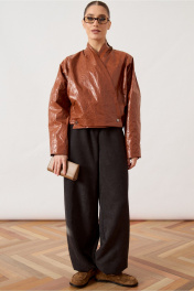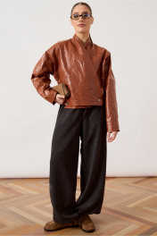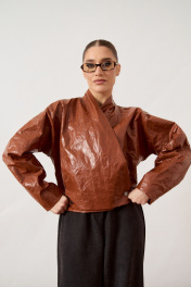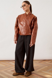 Куртка женская, укороченная, прямого силуэта, из кожи с эффектом «жатки». Модель с воротником-стойкой и глубоким запахом. Застежка асимметричная, на металлические кнопки по нижней планке. Перед и спинка с горизонтальными и вертикальными конструктивными швами. Рукав втачной, широкий, прямого кроя. Линия плеча слегка спущена. Изделие на подкладке, низ обработан вчистую.