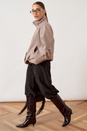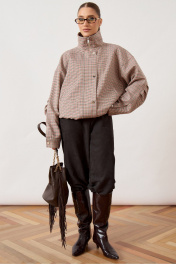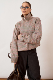 Куртка женская, объемного силуэта (oversize), выполнена из плотной ткани в мелкую клетку. Изделие со спущенной линией плеча и высоким воротником-стойкой. Центральная застежка комбинированная: внутренняя тесьма-молния закрыта широкой ветрозащитной планкой на потайных и декоративных кнопках. Перед с наклонными прорезными карманами в рамку. Рукав широкий, втачной, по низу оформлен притачной манжетой с застежкой на кнопку. Спинка с горизонтальной кокеткой. Низ куртки ровный, с внутренней регулировкой объема при помощи эластичного шнура и фиксаторов.