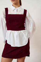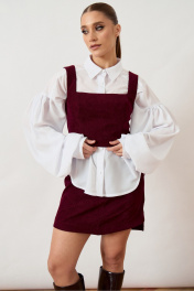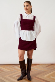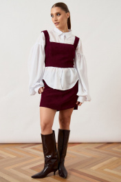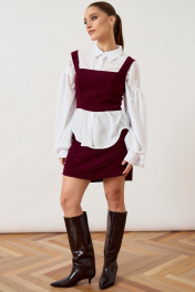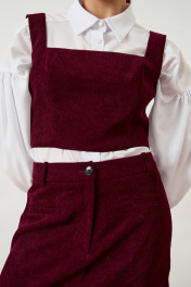 Комплект женский двухпредметный, состоящий из топа и юбки, выполнен из плотной фактурной ткани насыщенного винного оттенка. Топ приталенного силуэта на широких бретелях с квадратным вырезом горловины, плотно прилегающий по фигуре за счет конструктивных рельефов. Юбка длины мини прямого силуэта с классической посадкой на талии. Изделие дополнено притачным поясом и потайной застежкой-молнией в среднем шве спинки. Нижний край юбки ровный, обработан подгибкой. Комплект представлен в сочетании с контрастной белой блузой свободного кроя с объемными рукавами, что подчеркивает современный многослойный образ.