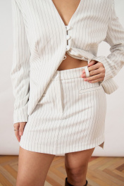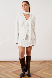 Комплект женский двухпредметный, состоящий из жакета и юбки, выполнен из светлой костюмной ткани в тонкую вертикальную полоску. Жакет полуприлегающего силуэта, на притачной подкладке, с глубоким V-образным вырезом горловины и акцентной линией плеч. Особенностью модели является притачная деталь в виде длинного шарфа, выходящая из плечевого шва и свободно ниспадающая вдоль полочки. Центральная застежка на шесть навесных петель и декоративные пуговицы, обтянутые основной тканью. Полочка с нагрудными вытачками и прорезными горизонтальными карманами в рамку в нижней части изделия. Рукав втачной, длинный, двухшовный. Юбка прямого силуэта в длине мини, на притачном поясе. Застежка на потайную молнию в среднем шве спинки.