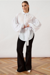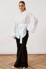 Блуза свободного силуэта (оверсайз) выполнена из легкой плательной ткани классического белого цвета. Модель с отложным воротником на стойке и центральной сквозной застежкой на пуговицы в тон ткани. Главным акцентом изделия являются экстремально объемные втачные рукава со спущенной линией плеча, собранные на густую сборку в нижней части, что создает выразительный эффект «фонарика». Линия талии подчеркнута широким съемным поясом-кушаком из основной ткани, завязывающимся на декоративный бант. Нижний край блузы имеет фигурный срез с закруглениями к боковым швам.