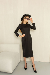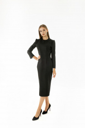 Платье прямого силуэта, с талиевыми вытачками, с округлой горловиной. Рукава втачные. Спинка со средним швом, обработана потайной молнией, разрез по среднему шву спинки. Цвет - черный.