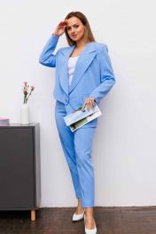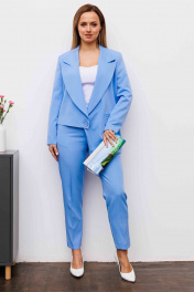 Комплект 2-х предметный, состоит из жакета оверсайз силуэта однобортного на подкладке и прямых брюк длиной7/8. Жакет имеет дизайнернерскую особенность - борта разной длины, ОГ 120, ОБ 122, длина рукава - 75 см, ( из них длина плечевого шва 13,50 см), ширина рукава в области проймы 40 см. Брюки прямые , длина 7/8, в боковых швах обработаны карманы, пояс притачной, обработан резинкой по задней половинке пояса, начиная с 50 размера. ОТ 74-86, ОБ 110, длина шагового шва - 71см, длина бокового шва ( с поясом) - 102 см