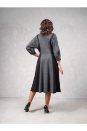 Элегантное платье приталенного Х-образного силуэта, средней длины. Винтажное оформление воротника с лацканами и отложеными клапанами в стиле "Служебный роман". Отделка контрастная с крупными пуговицами. Рукава цельновыкроенные длиной 3/4, на манжете с пуговицей.