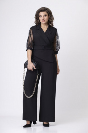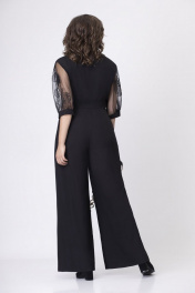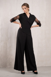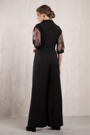Нарядный комбинезон из костюмно-плательной ткани средней плотности, немного тянется. Застежка на молнию и кнопки спереди. Воротник пиджачного типа. Брюки прямые, широкие. Длина изделия по спинке 157 см. Длина рукава 36 см.
