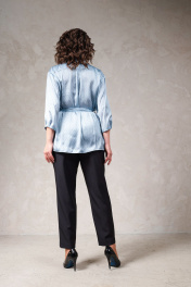 Удлиненная блузка из нежного атласа с V-образным вырезом и воротником-стойкой. Впереди выполнены отлетные кокетки. Также на спинке имеется кокетка. Рукава втачные 3/4 с мягкими складками по низу. Застежка вперелди на петли и пуговицы. Блуза комплектуется съемным поясом с пряжкой-полукольцами. По низу блузки выполнены разрезы.