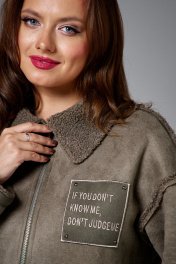 Дубленка из облегченной экозамши с меховой изнанкой, прямого силуэта, застежкой на молнию и меховым воротником со стойкой. Рукав длинный, линия плеча спущена. На переде прорезные карманы с меховыми листочками. Швы втачивания рукава и плечевые выполнены на лицо. Изделие декорировано нашивкой с авторской вышивкой.