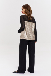 Джемпер свободного силуэта, с длинным рукавом и круглой горловиной. Рукава, передняя и задняя кокетка из ажурной трикотажной сетки. Нижняя часть изделия из мерцающего шелка. На переде авторский принт.