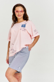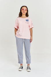 Футболка из хлопковой кулирки, умеренный оверсайз, со спущенным плечом и коротким рукавом. Вырез горловины круглый, с необработанной бейкой. Изделие декорировано авторскими принтами и джинсовой нашивкой с необработанными срезами.