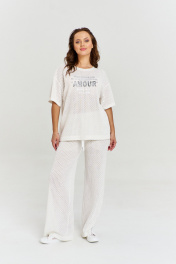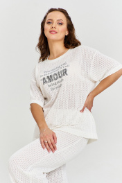 Джемпер из ажурного вискозного трикотажа, свободного силуэта, с коротким рукавом и круглой горловиной с декоративным довязом. На переде изделия авторский объемный принт.
