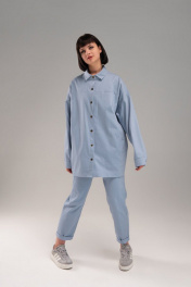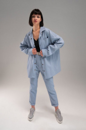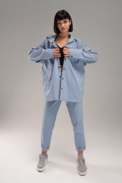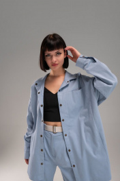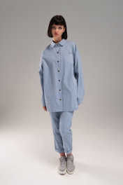 Широкая рубашка из тонкого джинса. На полочке 3 кармана: два в рельефах и один в шве кокетки. Застежка на кнопки. Дина рукава с учетом плеча 80 см.