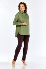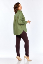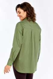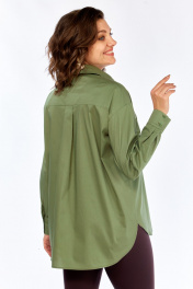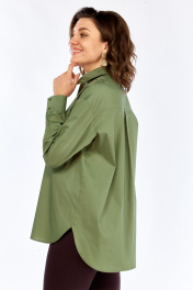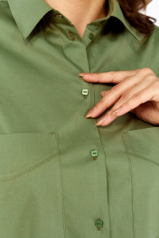 Рубашка свободного силуэта. Рукав рубашечный с разрезом и складками,заканчивается манжетой, которая застегивается на 2 петли и пуговицы.Плечо спущенное. На спинке двойная кокетка, от кокетки по центру спинки идет встречная складка. На переде вверху 2 симметричных накладных кармана. Длина по спинке(от точки основания шеи) -80см, длина по переду(от точки основания шеи)-75,5см, длина рукава+манжета-54,5см, длина плеча-21см. Ткань поплин, тянется по ширине.