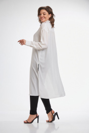 Рубашка свободного силуэта, прямого кроя, удлиненная. Воротник рубашечный классический. Центральная планка, петли-пуговицы. На спинке кокетка,от кокетки по центру спинки маленькая сборка. Спущенная линия плеча, низ рукава заканчивается притачной манжетой, застегивается на 2 петли и пуговицы. По бокам разрезы. Длина плеча-23см, длина рукава+манжет-57см, длина по спинке-120см. Длина разреза 51см. Ткань шифон. Параметры модели: обхват груди-98см, обхват бедер-110см, размер блузки на модели 50.