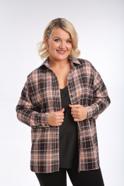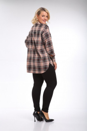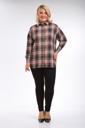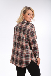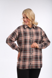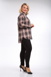 Рубашка свободного кроя.Низ переда и спинки закругленные, спинка чуть длиннее переда. Рубашка застегивается на петли-пуговицы. На спинке кокетка, по центру от кокетки тесьма-петелька. По всем швам выполнены отделочные строчки.Рукав рубашечный с разрезом и складками,заканчивается манжетой, которая застегивается на 2 петли-пуговицы. Длина по спинке(от точки основания шеи) -84.5см, длина рукава+манжета-58.5см, длина плеча-21.5см. Ткань тонкая фланелька. Примечание: параметры модели обхват груди 104см, обхват бедер 118см, размер рубашки на модели 54.