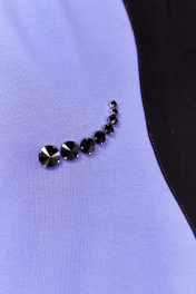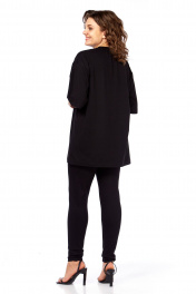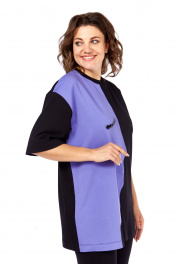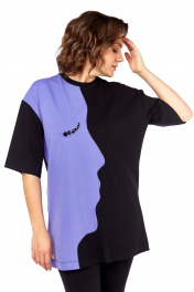 Майка свободного силуэта, со спущеным рукавом. Рукав короткий, чуть ниже локтя. По центру переда декоративный шов, выполненный в форме профиля,правая часть переда выполнена из ткани контрастного цвета. На правой часта декор из страз. Длина плеча-21,5см, длина рукава-29см, длина по спинке-82см.Параметры модели: обхват груди-98см, обхват бедер-110см, размер топа на модели 50.