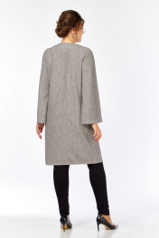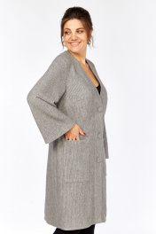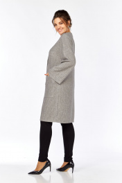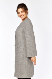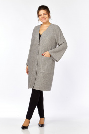 Кардиган прямого силуэта с длинным рукавом. Низ рукава расширенный к низу. Низ рукава и низ изделия обработан распошивалкой. По краю борта и горловинам переда и спинки обтачка. Застежка на петли и пуговицы. На переде накладные карманы. Длина по спинке(от пересечения плеча и шеи)-107см, длина рукава-61см.