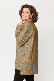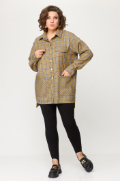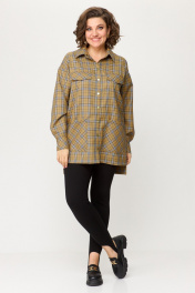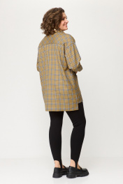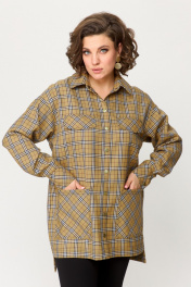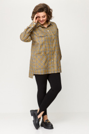 Рубашка свободного кроя.Низ переда и спинки прямые, спинка чуть длиннее переда. Рубашка застегивается на металлические кнопки. По всем швам выполнены двойные отделочные строчки. На переде внизу большие настрочные карманы, вверху переда декоративные клапаны. Рукав рубашечный с разрезом и складками,заканчивается манжетой, которая застегивается на 2 кнопки. Длина по спинке(от т пересечения шеи и плеча)-86см, длина по переду 81см, длина рукава+манжета-55,5см, длина плеча-21,5см. Ткань плательно-костюмная.