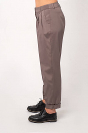 Брюки-бананы, сверху свободные со складками на поясе, к низу заужаются, имеются карманы.
