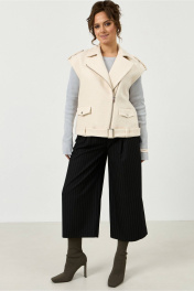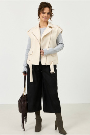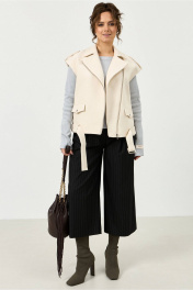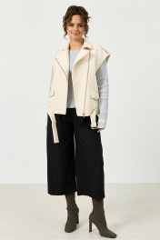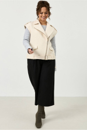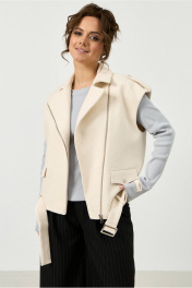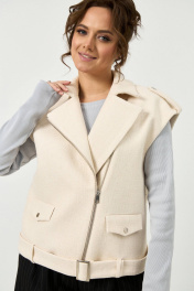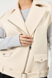 Жилет прямого свободного кроя, из твидовой ткани бежевого цвета. По переду застежка на молнию, съемный пояс. По бокам функциональные карманы с клапанами. Линия плеча слегка спущена. Жилет на подкладке.