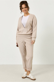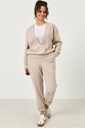 Комплект из трикотажной ткани в цвете капучино. Джемпер из трикотажной ткани, свободного кроя. Линия плеча спущена. Брюки прямого кроя, на резинке, из трикотажной ткани. По бокам функциональные карманы.