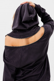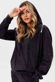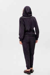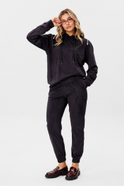 Комплект двухпредметный из мягкой искуственной замши, состоит из худи и брюк.Худи свободного кроя с капюшоном. Низ изделия и рукавов- притачной манжет. Боковые карманы в швах. Рукав- реглан. В шов втачивания рукава спереди, по верхней части спинки вставлена металлическая молния. Брюки прямого кроя, низ брюк - резинка. Боковые карманы с отрезным бочком. Верх брюк - притачной пояс на резинке. Длина брюк по боковому шву 104см.