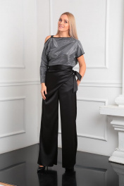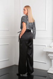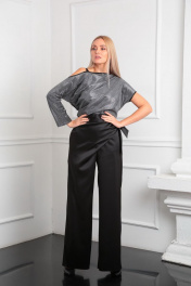 Стильные нарядные широкие брюки с запахом - отличный вариант для торжеств! Брюки широкие, расширенные к низу, полной длины. По переду потайная застежка. В боковых швах выполнены функциональные карманы. Изюминкой изделия является задрапированный запах, который завязывается на длинный притачной пояс, что создает неповторимый образ и в тоже время скрывает недостатки. Длина брюк 108 см