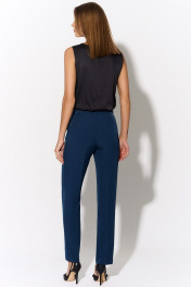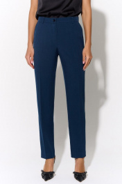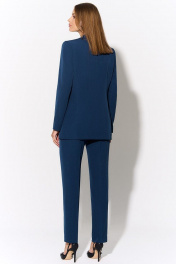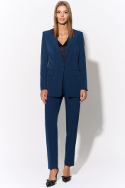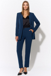 Жакет - полуприлегающего силуэта с центральной застёжкой на петлю и пуговицу; - воротник пиджачного типа с отложными лацканами; - по переду нагрудные и талиевые вытачки; - по переду прорезные карманы с листочкой и клапаном; - по полочке переда прорезной карман с листочкой; - по спинке средний шов и рельефы; - рукав втачной длинный, по низу шлица на петли и пуговицы; - на текстильной подкладке Брюки - средняя посадка брюк, зауженные к низу; - брюки на поясе, с центральной застежкой на петли и пуговицы с гульфиком на тесьму-молнию; - в боковых швах обработаны карманы с отрезными бочками; - задняя половинка брюк с талиевыми вытачками