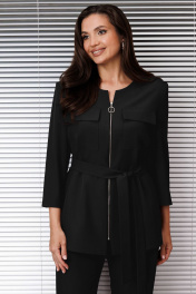 Комплект женский брючный, состоящий из жакета и брюк. Жакет прямого силуэта под пояс из той же ткани, без воротника, с полукруглой горловиной, с застёжкой спереди на молнию, рукав втачной 3/4 длины,по переду в верхней части накладные карманы с клапанами. Жакет на подкладке. Брюки прямые, свободные со стрелками, на поясе, по задней части пояса с эластичной тесьмой,с боковыми карманами.