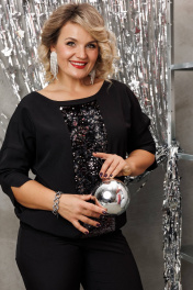 Комплект женский брючный, состоящий из блузы и брюк. Брюки широкие, прямые, на поясе спереди и по спинке с эластичной тесьмой, со стрелками. Блуза свободная, со спущенным плечом и 3/4 рукавом, по рукаву сверху разрезик, вырез горловины "лодочка", по переду- вставка из ткани с пайетками, по низу изделия-манжета, в которой по спинке вставлена эластичная тесьма.