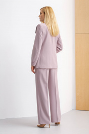Комплект женский брючный из костюмной ткани с эластаном. Жакет полуприлегающего силуэта, 2-бортный с отложным ассеметричнымворотником, по переду -карманы,рукав втачной со шлицей и пуговицами. Изделие на подкладке. Брюки прямые свободные, с боковыми карманами, на поясе с эластичной тесьмой.